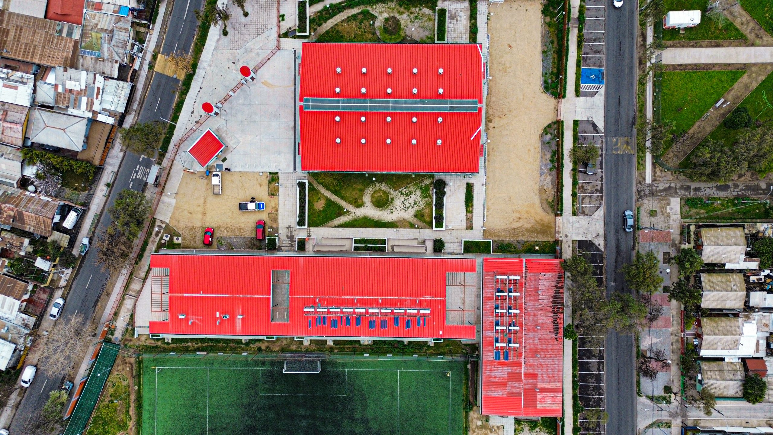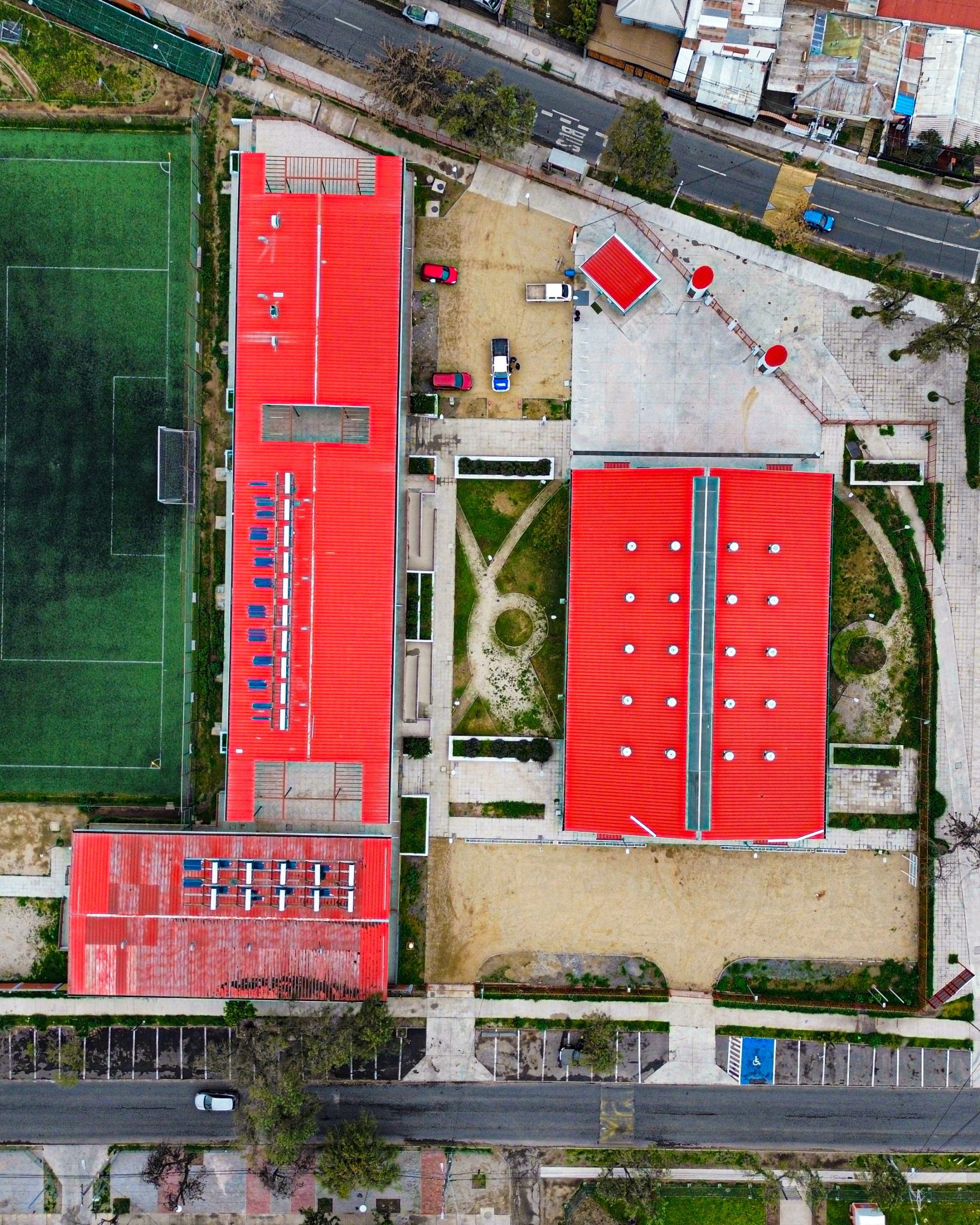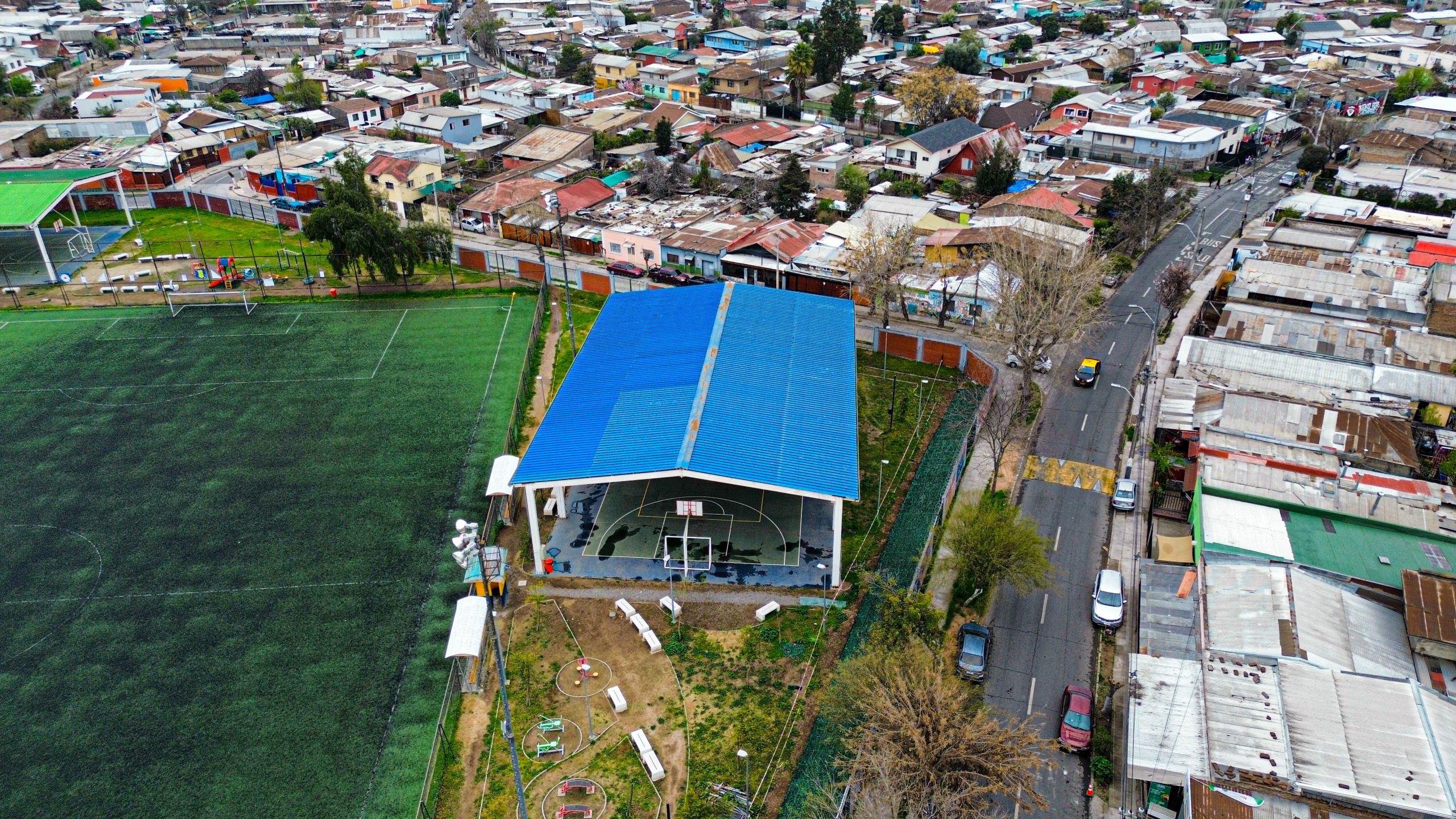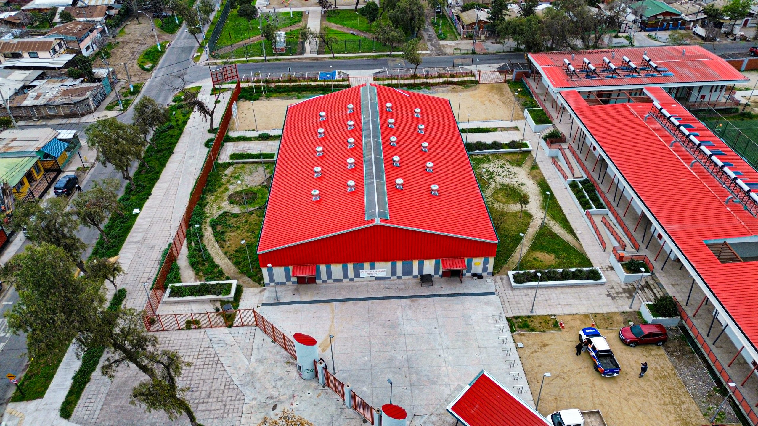 - Multicancha cerrada, con aros de básquetbol y graderías.